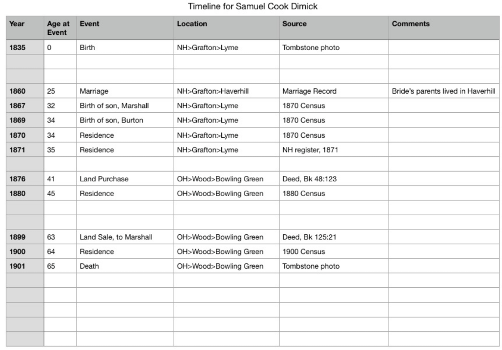 Second, what kind of information do you want to capture. You’ll need to decide on a format so your timeline is consistent. When I am using a spreadsheet, I will tailor the columns to fit my needs for that particular project. For a general timeline for an ancestor’s life, I use these column headings: