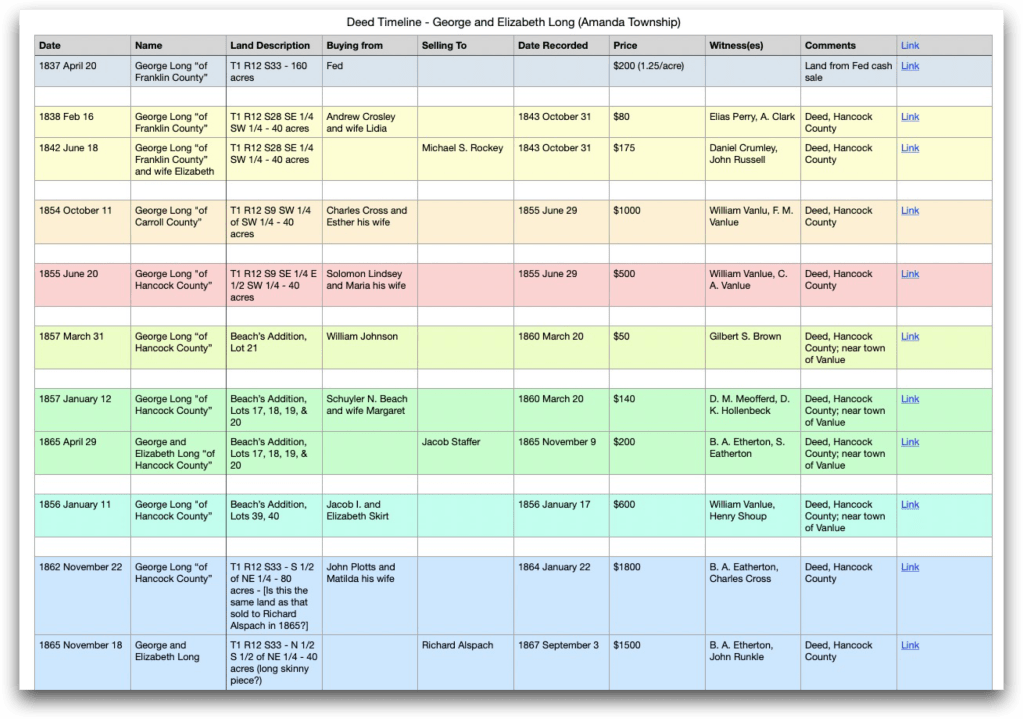 Sometimes in our research, we come across an ancestor who did a lot of land deals. And you may want to understand what he was up to in more detail. Putting those land records into a timeline can really help. These are sometimes called “in and out” tables and may not necessarily be intended as timelines, but if you set up your spreadsheet or table in a way that allows you to sort by date, that’s exactly what you’ve created. You can follow a particular piece of land AND you can follow a person’s land transactions.