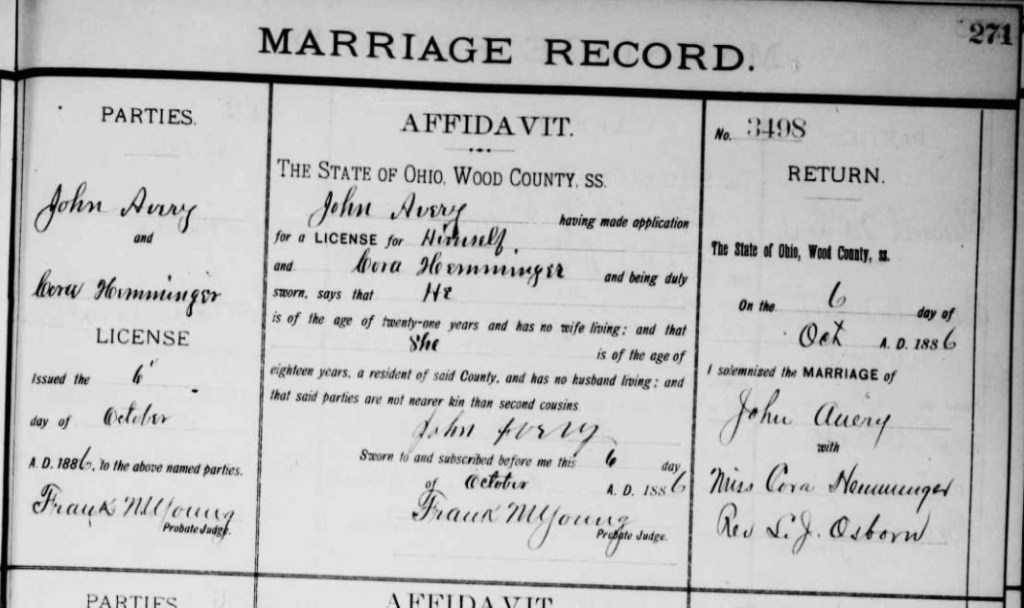 I’m working through the children of Gilbert Z. Avery, just grabbing their basics: birth, death, census, marriage, and obits, generally. According to my previous “research,” Gilbert’s son John B. Avery was married to Cora May Hemminger. I have their marriage record. They married in Wood County on 6 October 1886.1 However, as I’m working through the records this time, starting with Gilbert’s obituary and working through finding his children in the census records as adults, I found John B. Avery, in Arkansas where his father’s obituary said he would be. His wife was not Cora; it was Josephine.