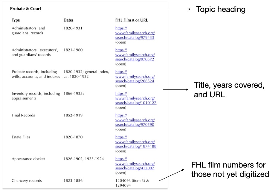 First, I have a “Miscellaneous” section for items that are unique to the locality I’m creating a guide for. In this section you might also put links for that locations FamilySearch Wiki page as well as miscellaneous resources that just didn’t fit elsewhere.