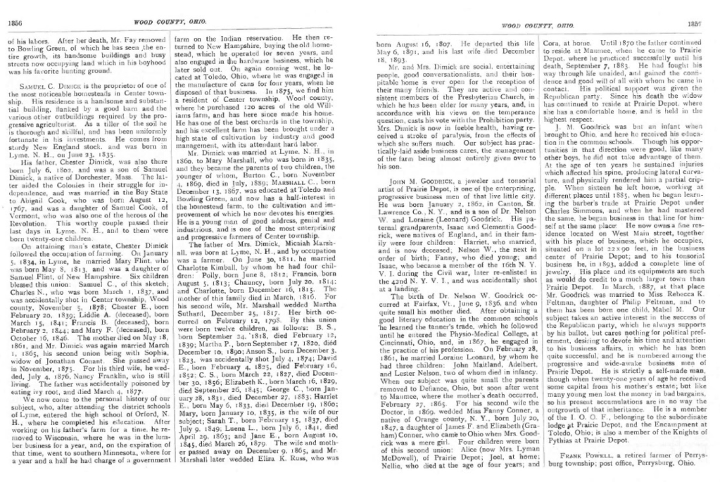 I mentioned my timeline for my ancestor Samuel Cook Dimick a few blog posts ago. Let’s take a look at his story. When I was first researching him, one of my main questions was “why.” Why did he take his family away from New Hampshire (where it is beautiful, I’ve visited) to Wood County, Ohio? Wood County is about as flat as flat can be (well, with the exception of large parts of Kansas and eastern Colorado, but I digress). Why was I from Ohio and not New Hampshire?