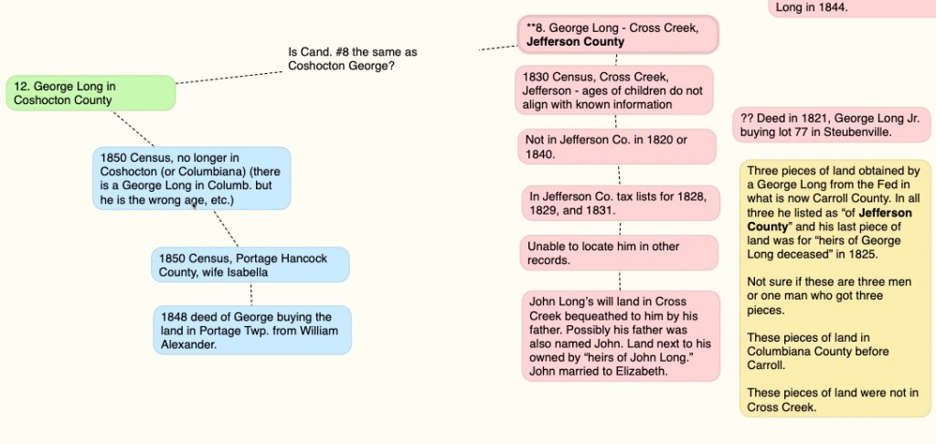In fact, the other George Long (whom I call “Candidate 11”) that lived in Hancock County has an obituary that mentions his service during the War of 1812. It seems they both were attributed with the service of the other George Long.