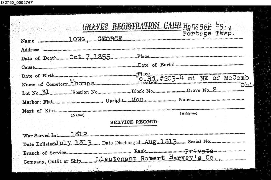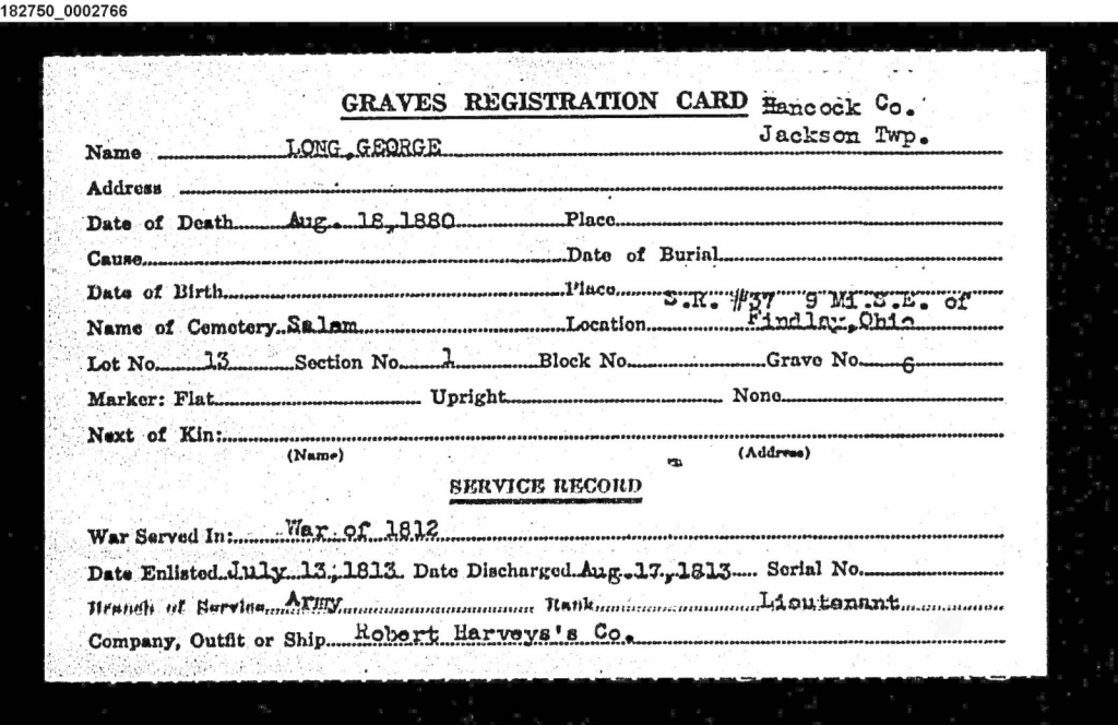 “My” George Long has been attributed as having served during the War of 1812. However, my research has indicated that he arrived in 1817 at the earliest. A “Graves Registration Card” for “my” George Long, who died in Hancock County in 1855, indicates that he was a soldier during the War of 1812 and served as a Private in Lieutenant Robert Harvey’s Company.1