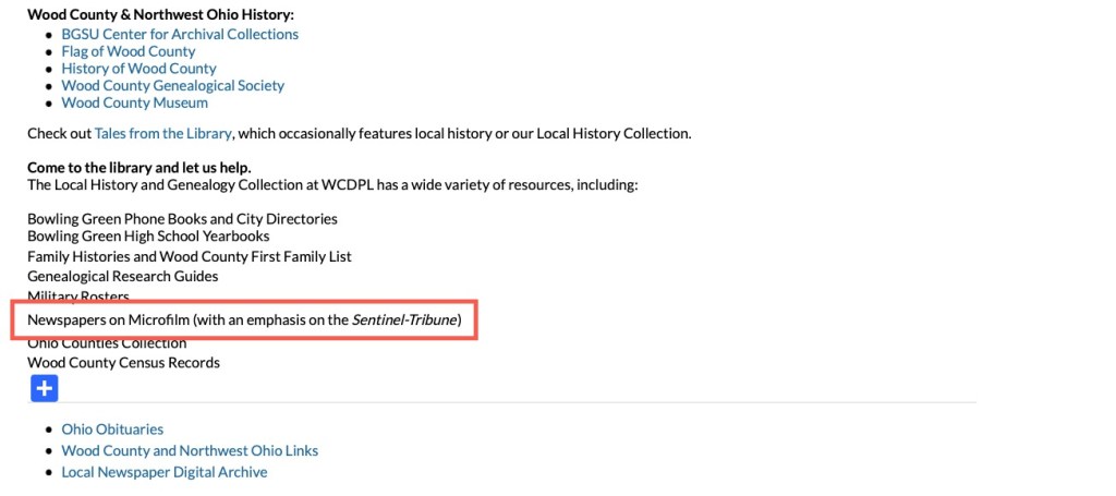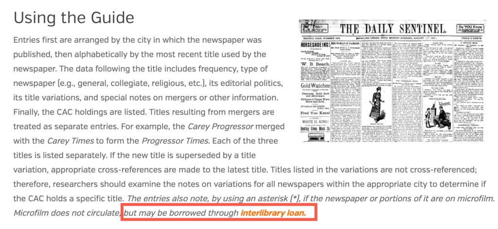 I have been able to access just about everything I need using one of the methods described above. I’d also like to point out that usually there is more than one run of those microfilm in other locations. For example, the Daily Sentinel Tribune from Bowling Green, Ohio is also available on microfilm at the Center for Archival Collections on the Bowling Green State University Campus.