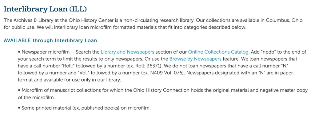 Is interlibrary loan a possibility? Before you assume it isn’t for newspapers on microfilm, let me point to you to the Ohio History Connection website. They offer interlibrary loan on their newspapers on microfilm! I don’t see this option often, so my point is: LOOK at what services are available for a given repository.