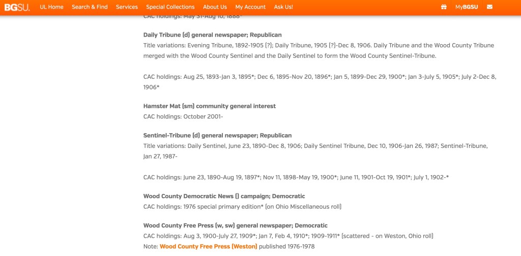 The first step of this I also call the “pre-research.” If you’ve listened to any of my lectures, I use this phrase a lot. It is the research you have to do to be able to do the research. Make sense? Clear as mud? Well, let’s clear it up. I have a perfect example. I conduct a lot of research in Bowling Green, Wood County, Ohio. That’s where I was born. Many generations of my ancestors lived in Wood county since at least the 1840s. Newspapers from Wood County are only slightly digitized and available online. The main newspaper for Bowling Green is not. So, what’s a researcher to do.