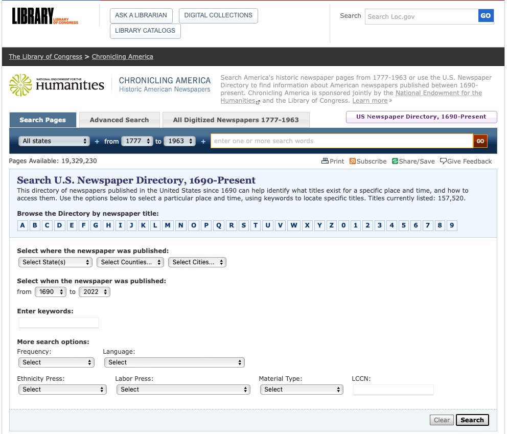 Chronicling America – I utilize their “US Newspaper Directory, 1690-Present” to determine what newspapers existed for the area of focus.