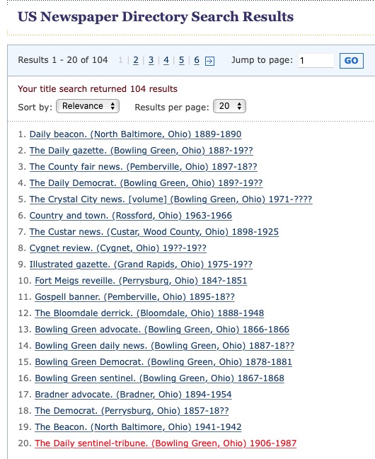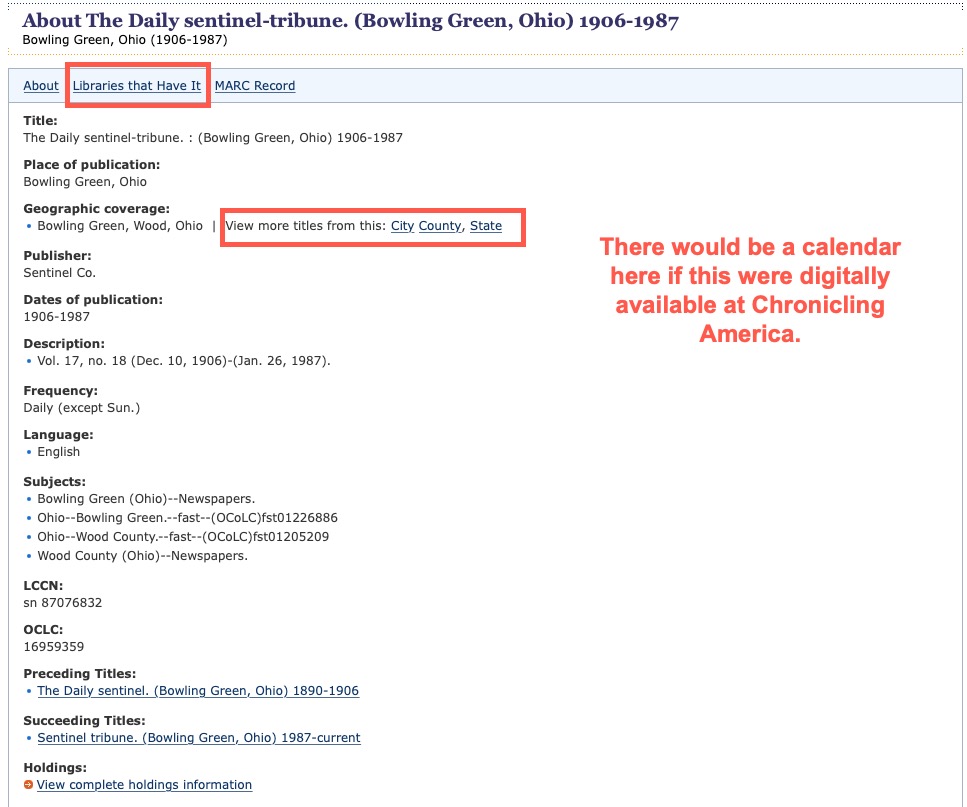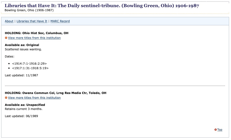If there were a digitized version at Chronicling America, there would be a calendar view of available issues in the large white space to the right of the catalog entry. In this case, there is not. If you want to see other titled in that city, county, or state, there is a button for that. However, the most valuable button on this catalog is the “Libraries that Have It” link at the top. I issue a word of caution, however. This particular entry does not list the Wood County District Public Library in Bowling Green, which I know for a fact holds the entire run on microfilm. I’ve spent countless hours there going through the films.