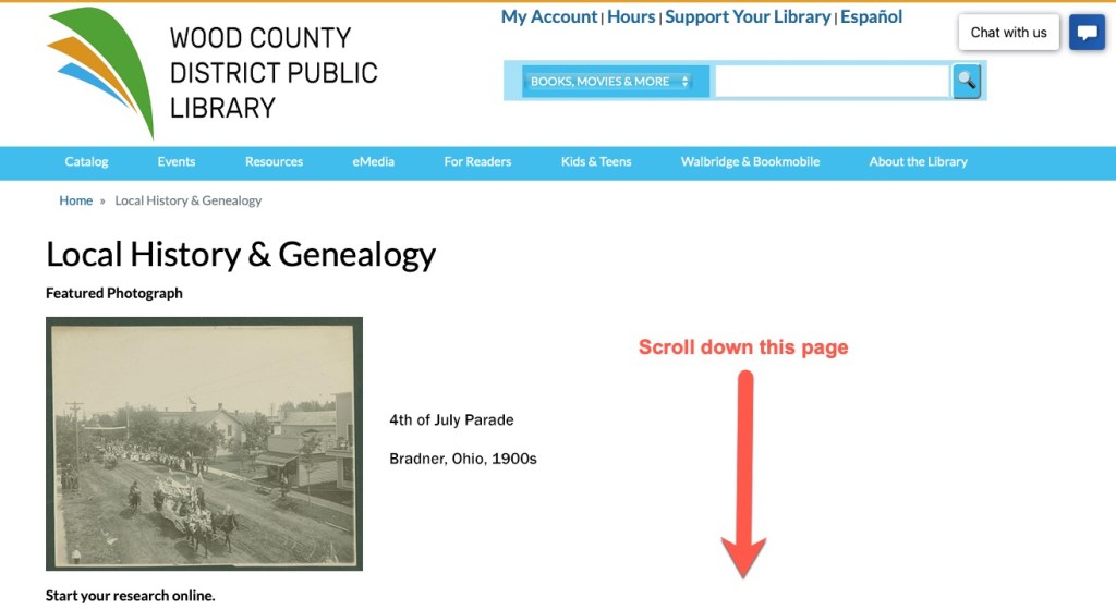 To learn about these you could do a simple Google search (‘Wood County Ohio public library,’ for example) or you could use other resources such as Cyndi’s List or the FamilySearch Wiki for genealogically specific information. Let’s look at an example.