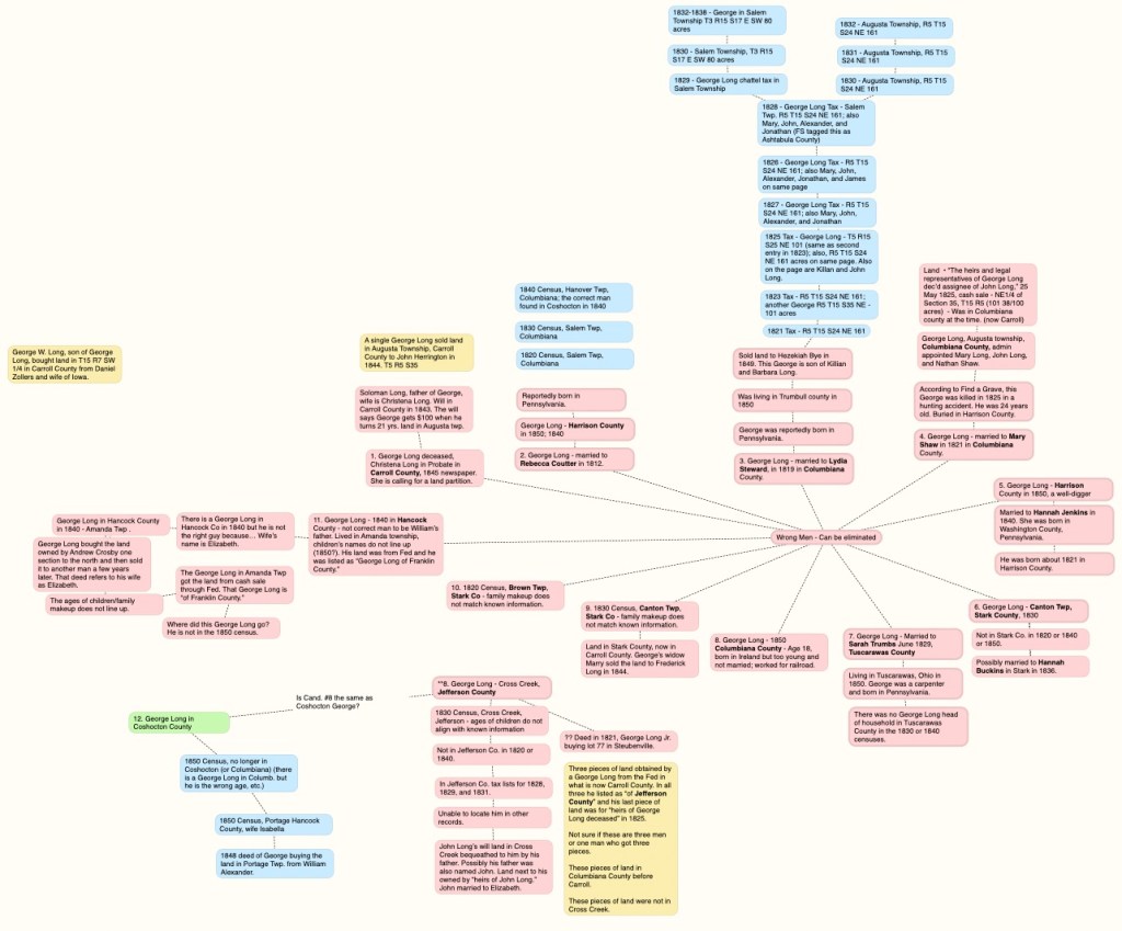 For George Long, I had twelve candidates. Many of them I could easily eliminate, usually because they didn’t end up in Hancock County, Ohio. Some of them died too early, or married women not named Isabella. But when I narrowed in on the “correct” George Long, I found him in a couple of locations before he made it to Hancock County. I had to be sure his time in those locations made sense. A timeline did this for me.