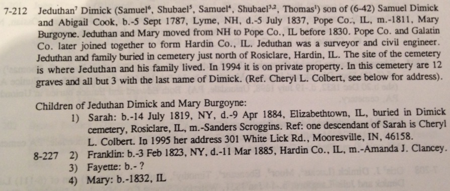 In the case of Jeduthan Dimick, I knew from his biographical sketch in the compiled genealogy that he died in 1839 in Pope County, Illinois. Using census indexes at Ancestry.com I located Jeduthan and his household in the 1830 census in Hardin County, Illinois.