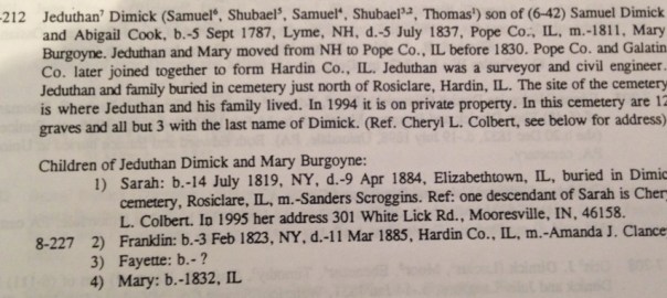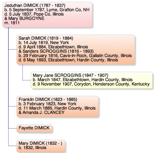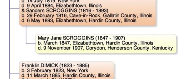 2014-03-31 09.39.29 pmSanders Scroggins land is within the green square on the left of the screen and Jeduthan and Mary Dimick’s land is within the square on the right. The families lived fairly close to one another, possibly attended the same church, social gatherings, or perhaps did business in the town of Rosiclare or Elizabethtown.