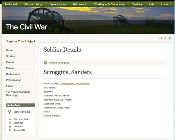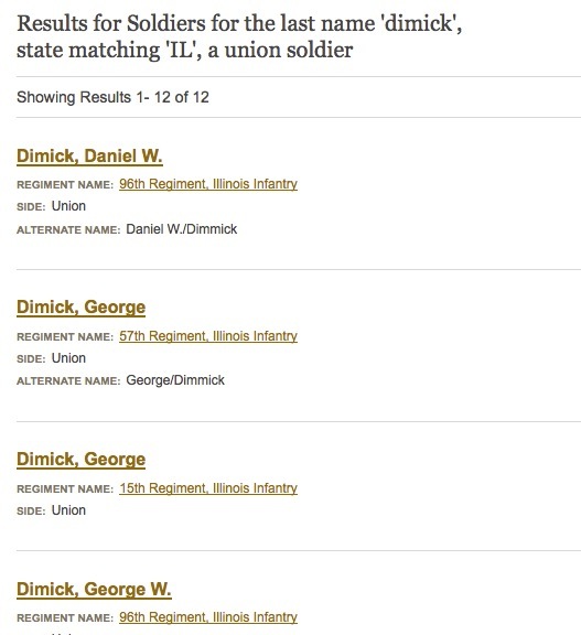 It is always wise when working in the early to mid 1800s to check military records, either for War of 1812 or Civil War soldiers. There are growing collections coming online all the time for these 2 groups of soldiers’ records. The first place I look to determine if a person I’m researching was involved in the Civil War is the National Parks Service’s Soldiers and Sailors Database. This is an index to all who served in the Civil War on either side of the conflict. A quick search for Dimick and Scroggins provided the following 2 results: