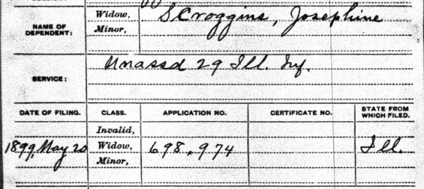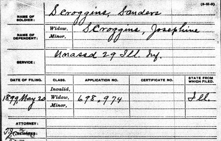 This told me that Sanders Scroggins enlisted during the Civil War. Sarah (his wife) had a brother named Franklin Dimick. No entry was found for him. Once I determined Sanders had enlisted, I began searching for more information about his service. One great online repository for military records is Fold3.com. There I found a copy of a Widow’s Pension from his widow (and third wife) Josephine Scroggins.