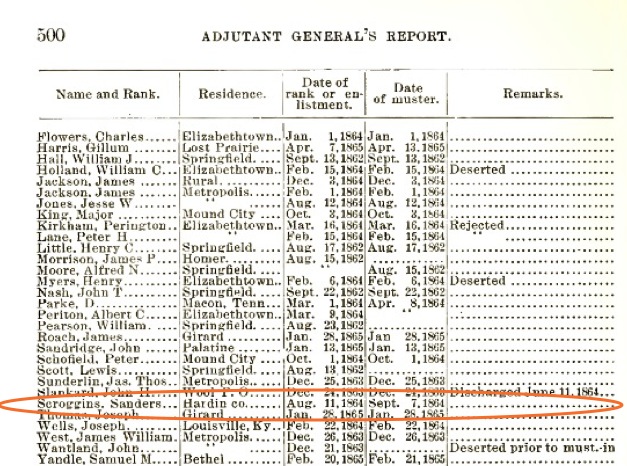 The Scroggins household is located in the Gallatin County census enumeration. Sanders has moved into his own household and is living next door to his father’s home. He has only one female of about his age living with him, likely his first wife, and no children are living with him.