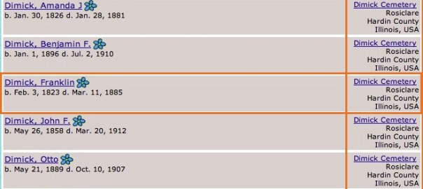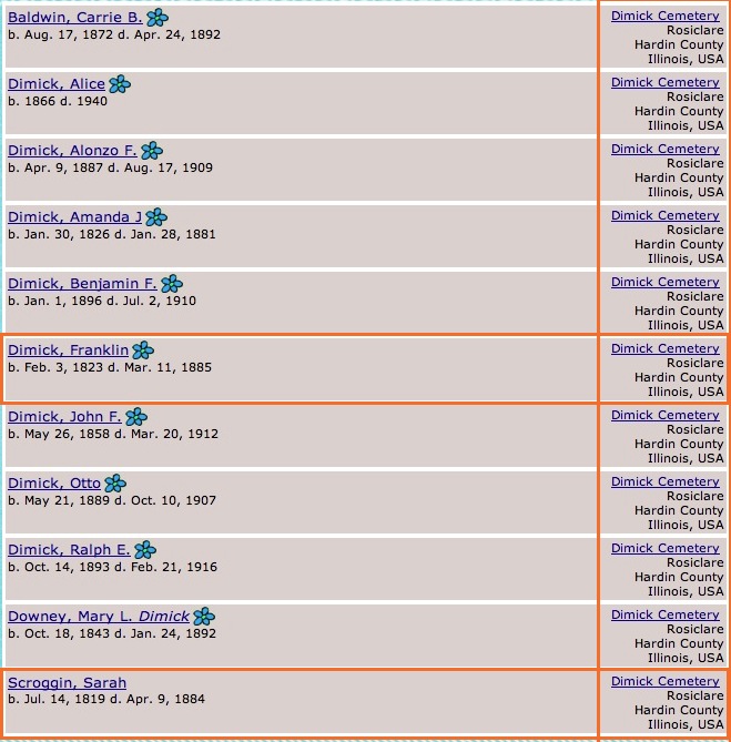 There are several entries, including Sarah Scroggin(s) and Franklin Dimick in “Dimick Cemetery.” However, there are no photographs for either of them. Further research indicates that there are no tombstones or they are quite weathered and that this is a cemetery on private property, at one time being owned by the Dimick family. It is located near the town of Rosiclare, Illinois.