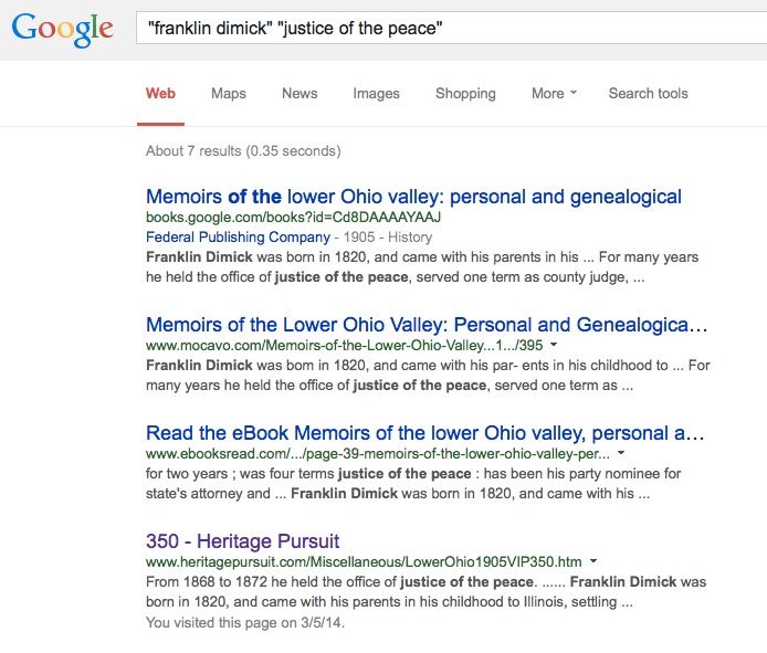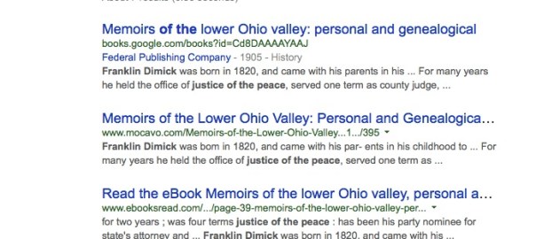 Sometimes I begin with this, sometimes I remember to do it later. But sometimes, I do a straight up Google search with the name I’m researching in quotes. Sanders Scroggins, Jeduthan Dimick and Franklin Dimick are such unique names I did just that. They didn’t turn up much except when I decided to look more into the fact that Franklin was a Justice of the Peace. A Google search for “franklin dimick” “justice of the peace” turned up a county history I hadn’t found before when searching for Hardin County histories.