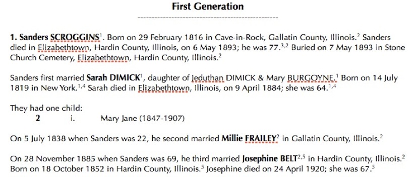 Son Sanders Scroggins, 1816-1893, m. Sarah Dimick (his second wife)
