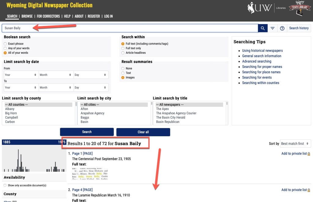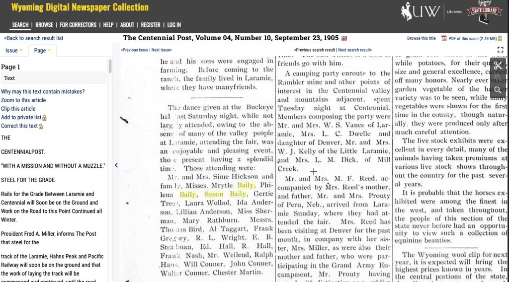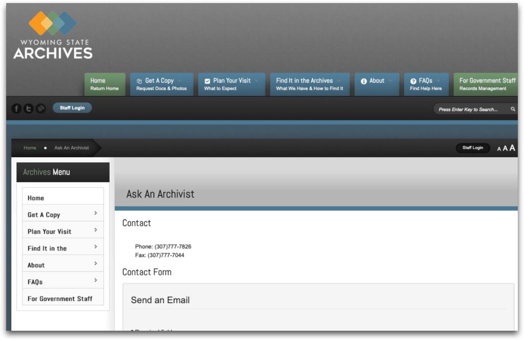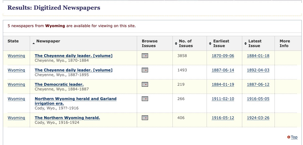 Every state is going to have a similar list of resources available online, so you can take what I share here and search for something similar in another state your are researching in. Most states will have a state archive and/or library. There may be a statewide digitizing project. You might find several universities that have archival collections. (In the case of Wyoming, there is only one, the University of Wyoming in Laramie.) There may be specialized museums around the state that have archival and research collections. And when I say “online,” I mean they have a web presence which may only be a catalog and you might need to contact them for copies or to find a research proxy.